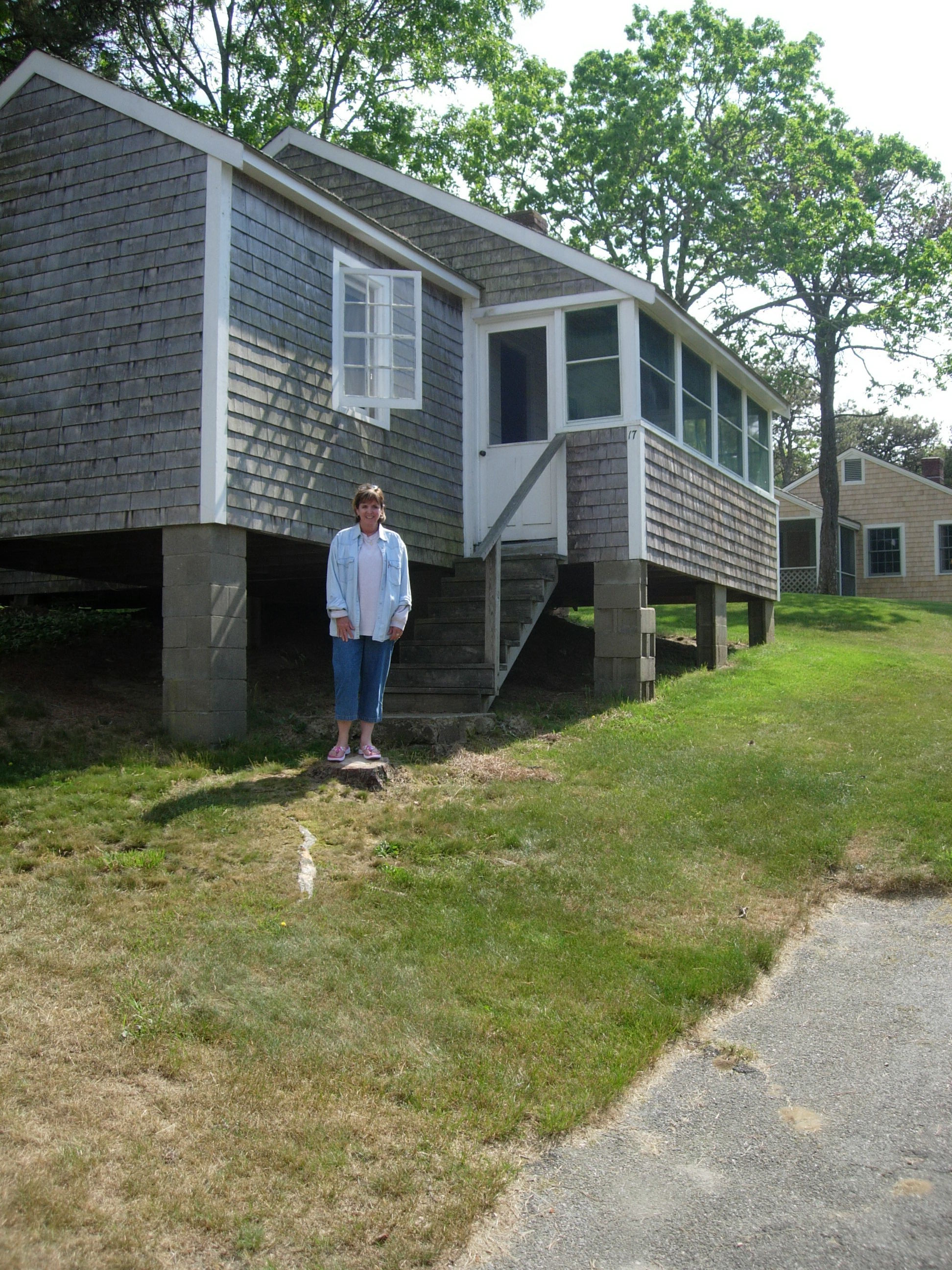 This is our family reunion on Cape Cod. Me in the Red Cape Cod sweat shirt, Jonathan (Jon’s son in the Black Sweat shirt), then Jon. Ale is the blond behind me and Carolyn (Cousin David’s (RIP) wife mostly hidden), David & Doug and then Dick behind them. It was a great time. We stayed at “Pilgrim’s Village” in the same cottages we stayed in as kids back in the 50’s and 60’s. It hadn’t changed much! This is the cabin Jon, Ale, Jonathan and I stayed in and also a picture of Jon enjoying that wonderful New England Lobster: