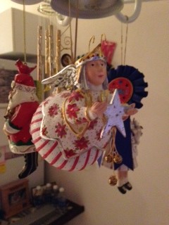 I’m having trouble with the other picture. There it is. I just had a “computer freeze” and lost some of this post….now where was I? (I got distracted and saw that you can “print” this post now and when I tested it, my computer froze and I had to reboot). Anyway, I was talking about my Chandelier “Tree”. I now have the 2 ornaments that Suzanne gave me on it. Also I have a little “Dutch Girl” hanging on it that was given to me by my mom’s friend “Babs” when I went up to Clearwater to close her condo after she died. I love that little ornament – the legs swing on it. Babs also gave me a cute little kitty on a pillow and when you pick it up, there is a fish under the pillow. So sweet. Then I hung a seasonal “Santa” on it. I got that ornament from my boss at The Registry when I worked there. It was funny. They were Jewish and for the 2 Christmases I worked there, I received a Santa Claus each time. The one I hung in the kitchen was the cutest one. The other thing I have hanging from the chandelier is the sweetest little wind chime. I think Jennifer gave it to me on one of our “Beaches” weekends. Anyway, it has the most delicate sound and when I get up from the kitchen chair and hit it with my head, at least it has a nice “twinkling” sound.