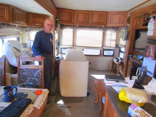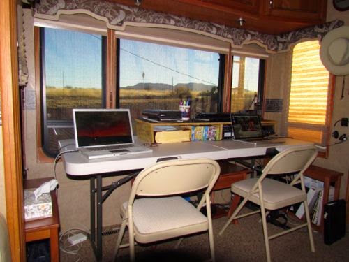 Bill and Cathy are shaking it up in their RV. I sent a recipe to Cathy last night and she reminded me of their blog so I went there and lo and behold they are taking out my bed! Instead they have replaced it with a “temporary” desk area. I can relate to that. I not only have my “office/den” with a desk and couch and desktop computer, I also have my diningroom table that I use for my “alternate” desk and kitty sitting area! So let me see if I can get her pictures to show here as the transition – of course I could just tell you to go to their blog, but OH NO – let’s TRY IT!