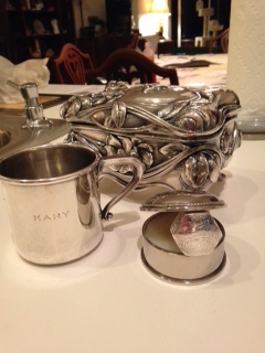 It takes a visit from someone to motivate me to polish the silver. I used to have a lot more silver from my mother, but I’ve gotten rid of it through the years. I love it when it is polished, but I don’t do it too often. These are the final pieces I own. Just enough to enjoy without too much work!