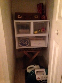 I’ve said that my brother Bill and his wife Cathy are coming to visit. They are staying out “in the swamp” in their RV. They haven’t seen my new house or met my little kitty Metaxa – I can’t remember if they’ve seen Domino in person yet. So I’ve been working on getting the house ready a little for them. I fixed up the closet in the den. I had just put everything in there on the floor since I think it was used as a “clothes” closet in the past. So I went to my favorite neighborhood store, Walmart, and bought some “organizers”.