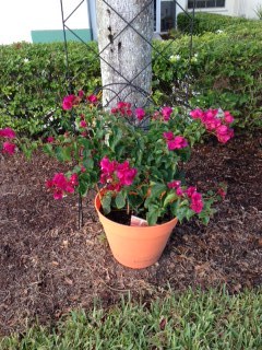 I want the bougainvillea to grow up the trellis and around the Palm tree. I’ll try to train it to do that, but I know I need to look out for the prickers. Wow “prickers” – haven’t used that word since I was a kid I don’t think – I guess the “adult” word is thorns.