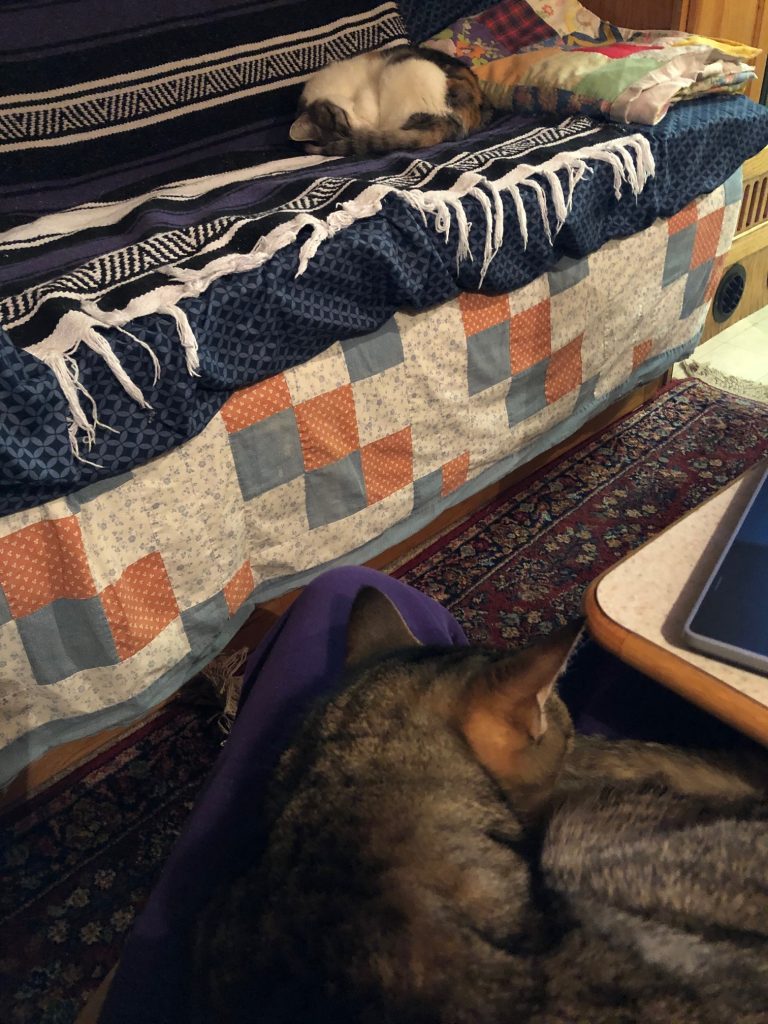 So this morning, I have Metaxa in my lap. I think she is getting a little bit more acclimated to the rig. She enjoys looking out the window and jumps up to the bed above the cab. Once I get the pictures and the clock out of that area in Arizona, I’ll set up the bed up there. Now it’s a matter of deciding where to have my head. I think it is big enough to sleep in either direction. If I go long wise over the drivers side, the other side of the bunk can be used to store things like extra paper towels and the cooler. The cooler is up there now.