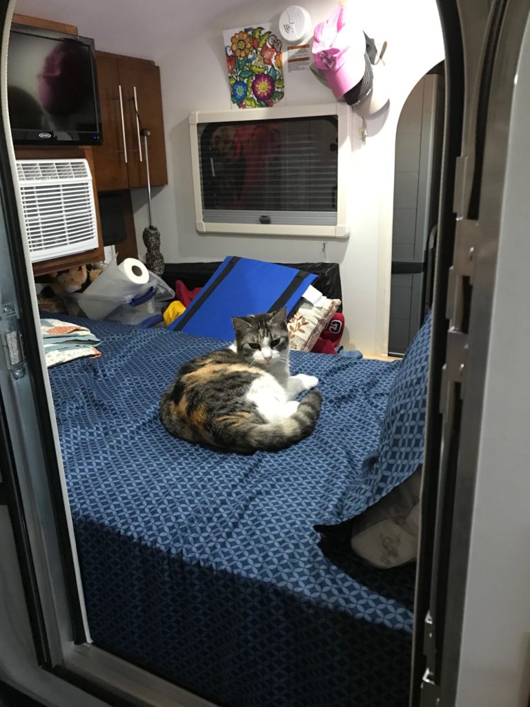 So I’m home now and still “high” on my camping trip.  Still dreaming about it and saving pictures and printing pictures and enjoying life with Olivi@ in the garage.  I put the foam topper on the bed and went out and rested on it the other day.  I made up the bed and Wylie jumped in and joined me.  I think she’ll be on a trip with me one day.  I’m still waiting for her playpen.  Wonder if it will ever come.  I should know better than to buy those things off of FB!  Anyway, I’ll get one someday.