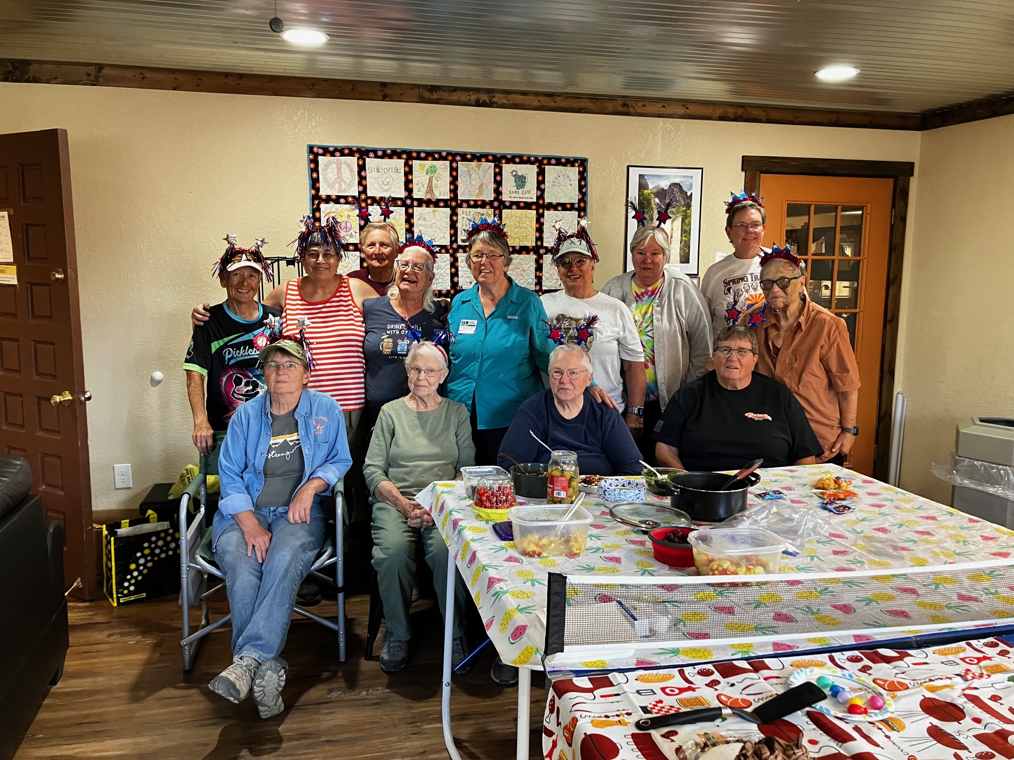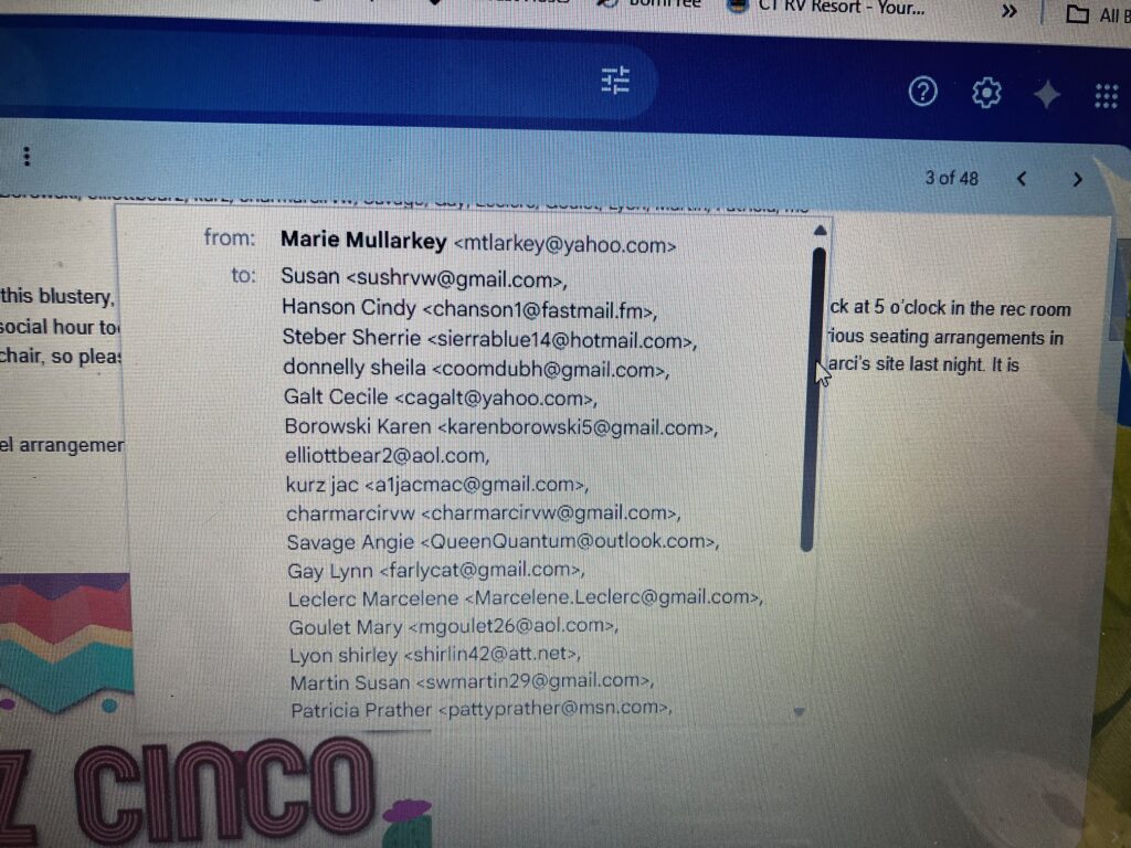 List of attendees with Genie and me also. It’s just about time for the 5PM Pot Luck. I needed to split up my beans and microwave them. Now I think they are hot enough in the slow cooker. Time will tell. I’ll be back later to continue this. Of course, according to Sue there was a little “drama”. Can’t wait to hear it all.
