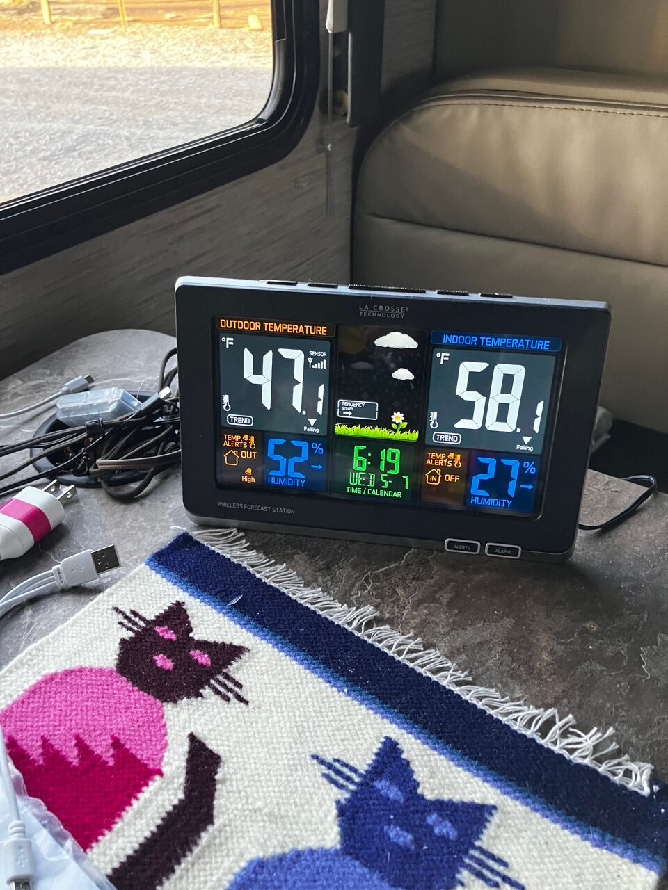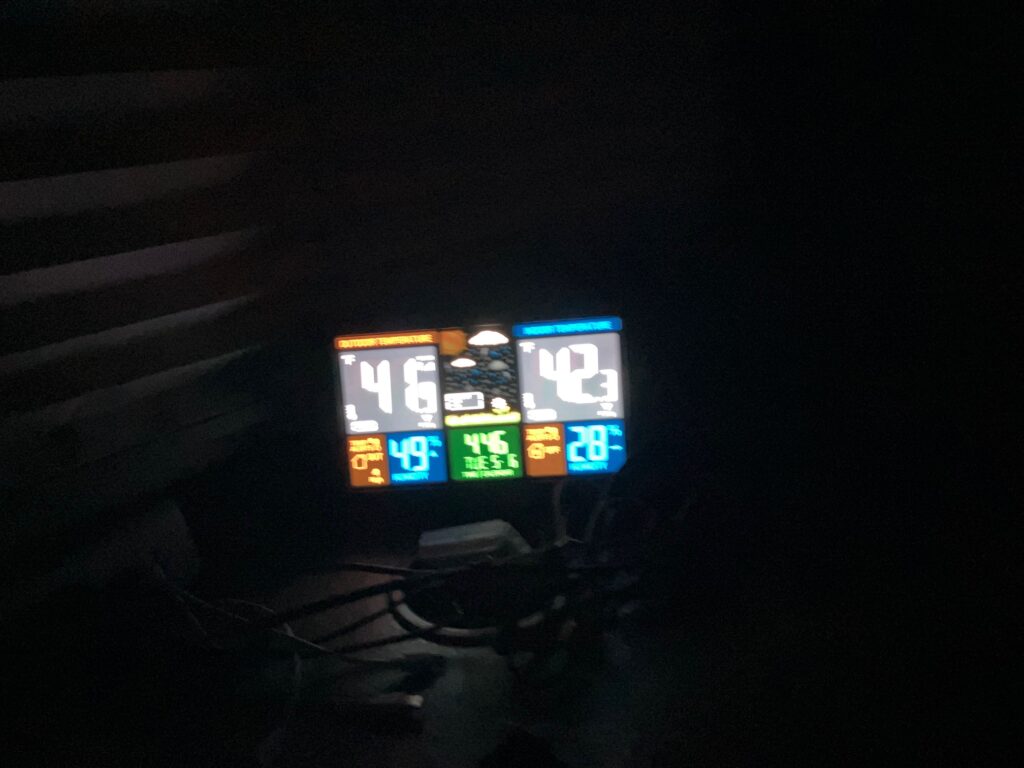 These were my temperatures this morning. It’s a little blurry, but I think you can see it. The furnace cycled twice and now I have the radiator on and it’s 50 degrees inside now. I ran out of propane in my Little Buddy, but I think I have another can in the storage – I’ll get that later. My coffee tastes great this morning. I started the meeting (got up finally when I realized what time it was) and didn’t have coffee to start, but I made it as I listened to the meeting. It was a great meeting. Everyone wants to RV with me!