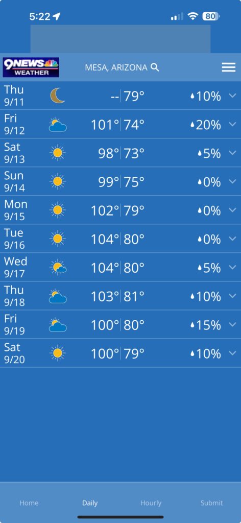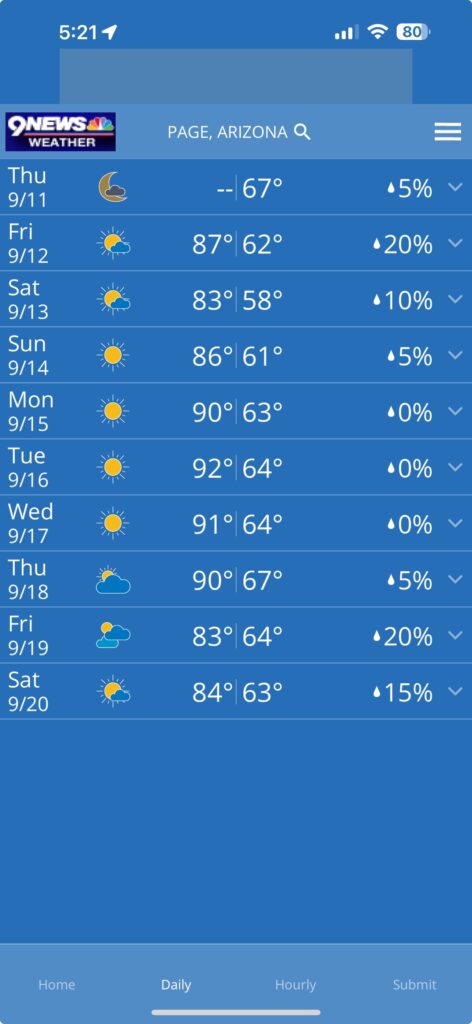 In a week I’ll be on the road again. Here are the temperatures in Page and Mesa for the next week or so: