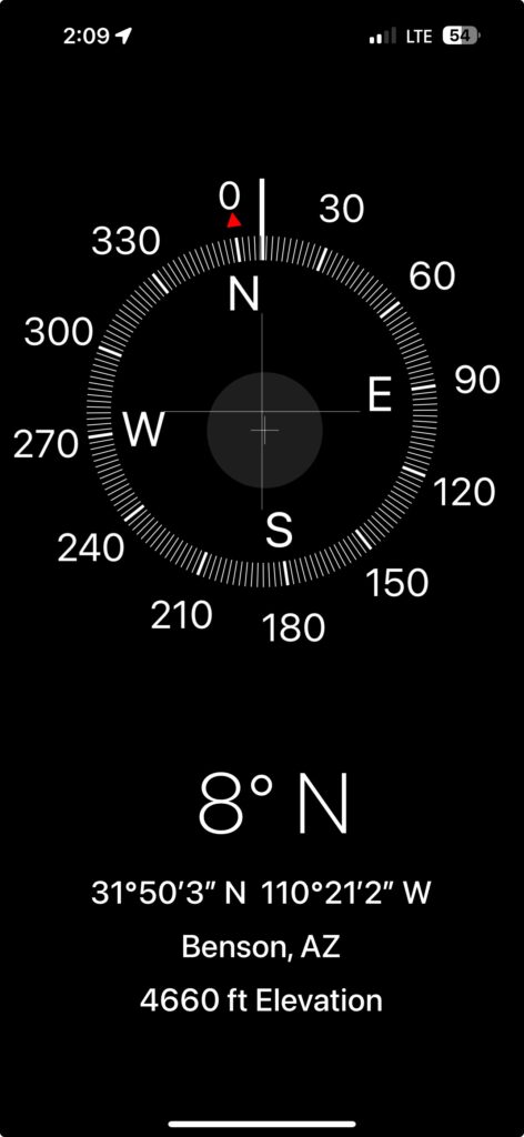 I used my phone for navigation. My GPS doesn’t like the way we came. Went through Tucson on Oracle by Catalina State Park. Took GRANT over to I 10 and drove down to Benson. I think the gas price is $2.65 – $1.00 less than MESA!!!!!