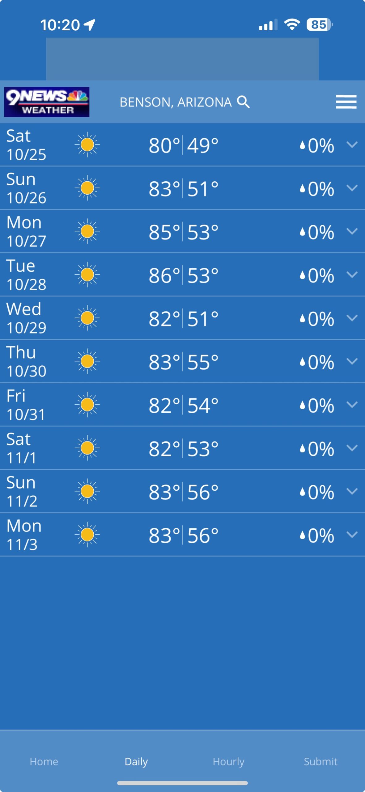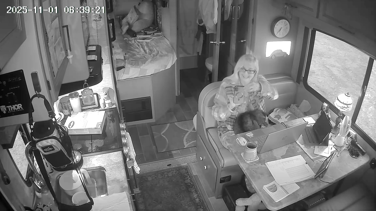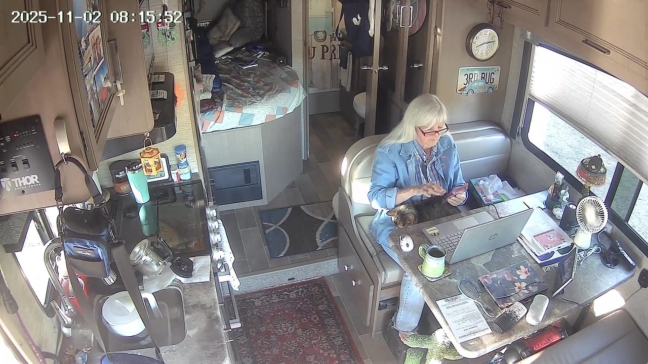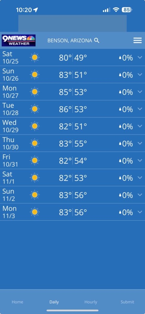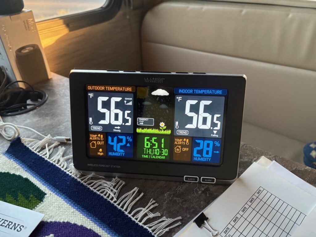 It’s Sunday, November 2, 2025. It’s my last day at Kartchner, but I’m just travelling up the road to CT-RV to spend the night with Bill and Cathy. I’m not leaving here until 12:15 or so. They are going to church and won’t be back until 12:30. So I’ll wait until they get back to travel over. I may stay a few minutes in the overflow lot again. We’ll see. Right now I’m waiting for the meeting to start but look at these temps and look at the time: 5:47AM!