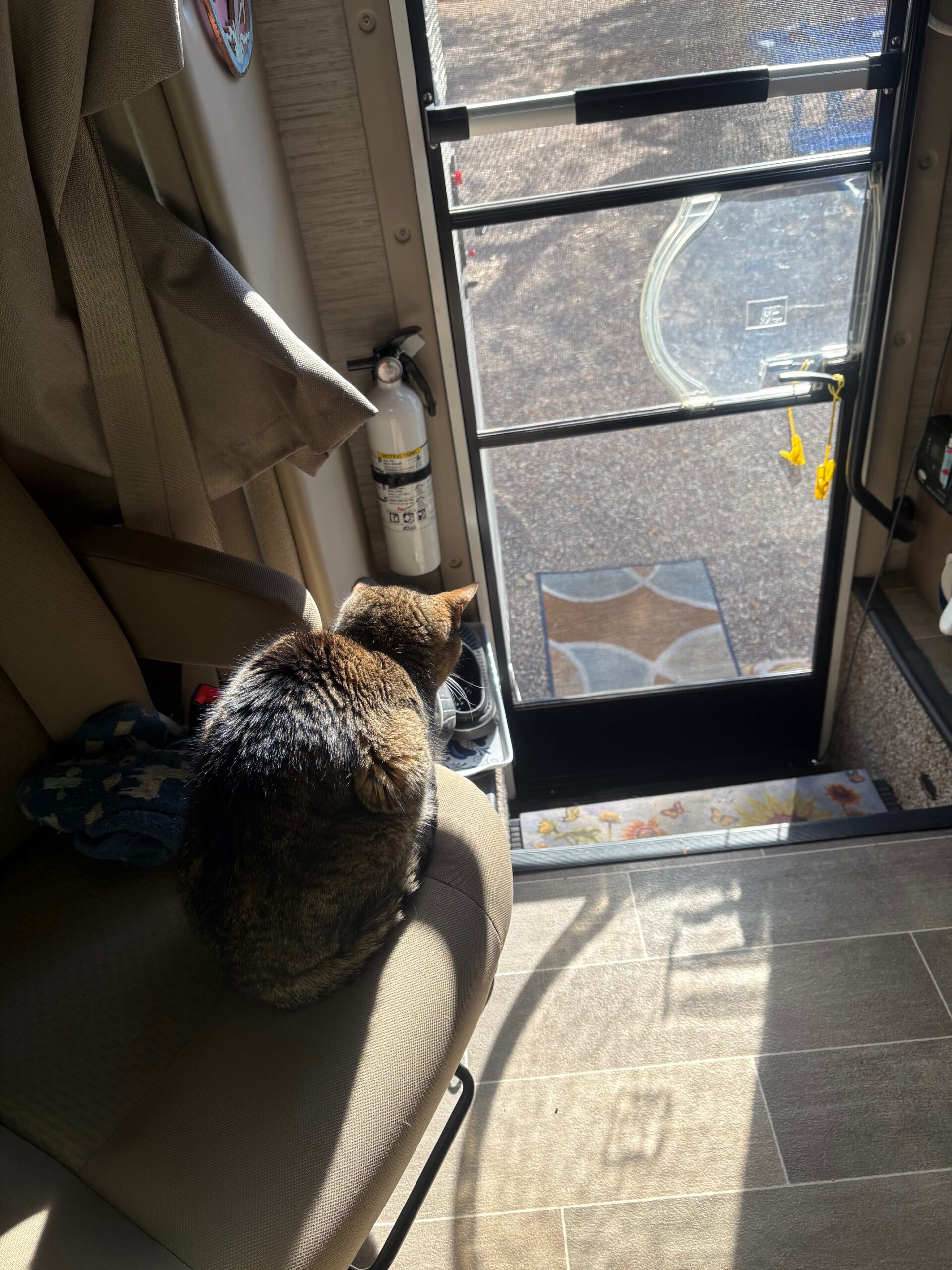 If you look closely at this picture you can see Metaxa in my lap! I just LOVE my camper. It is so comfortable. I’m glad it is a 2022. I feel it has a LOT of years ahead – especially for me when I’m alone camping. I really feel free in here. I love my life in MESA with Jack and the baby kitties, but coming camping with Metaxa is such freedom for me. I could live in here if I needed to, but I don’t think that will ever happen.
