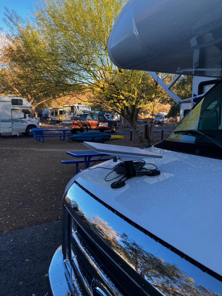 It is beautiful now. It’s sunny and breezy. It was really windy driving up here. The wind has died down a little. Here is my Starlink set up this year: