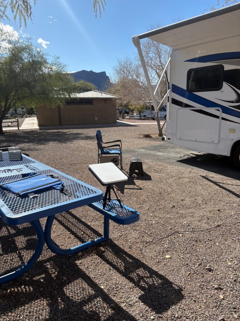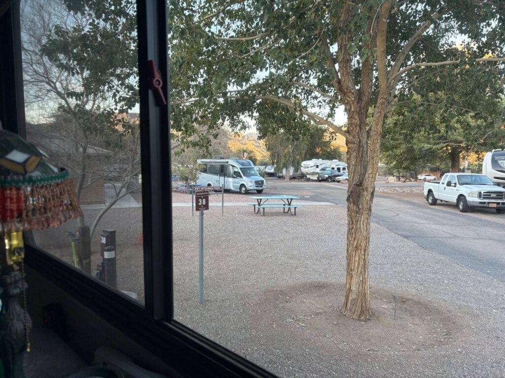 It is a beautiful sunny day here today. I love the windows by the dining table. They are SO BIG and the view is spectacular. I’m really HAPPY, HAPPY, HAPPY! I’m going to get dressed soon and go for a walk around the campground. I like seeing other rigs. But I’m really happy with my rig. It is perfect for me.