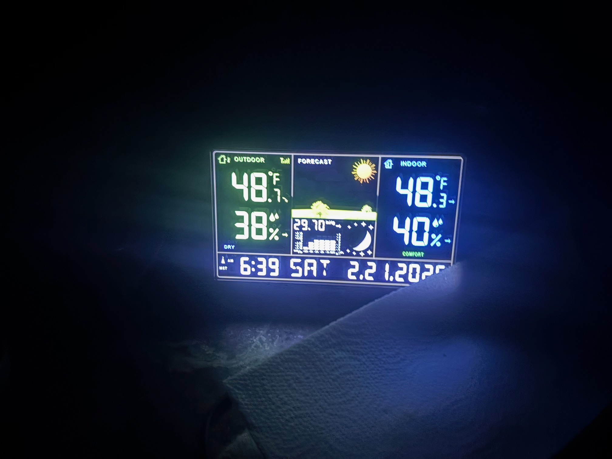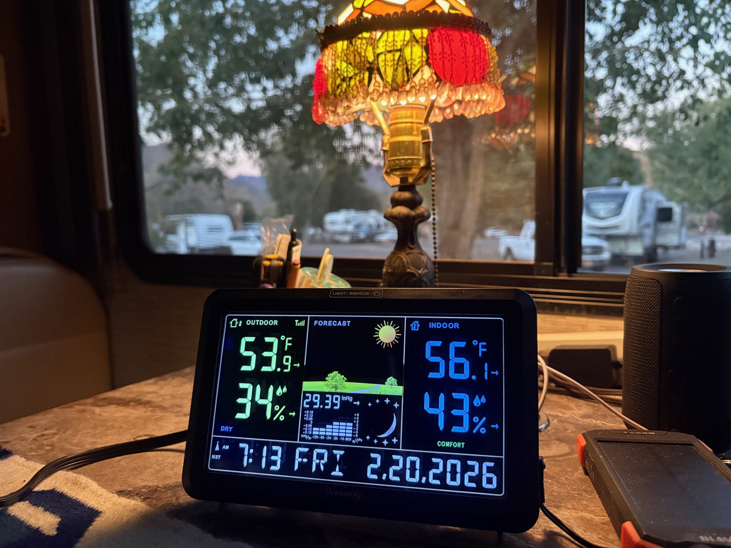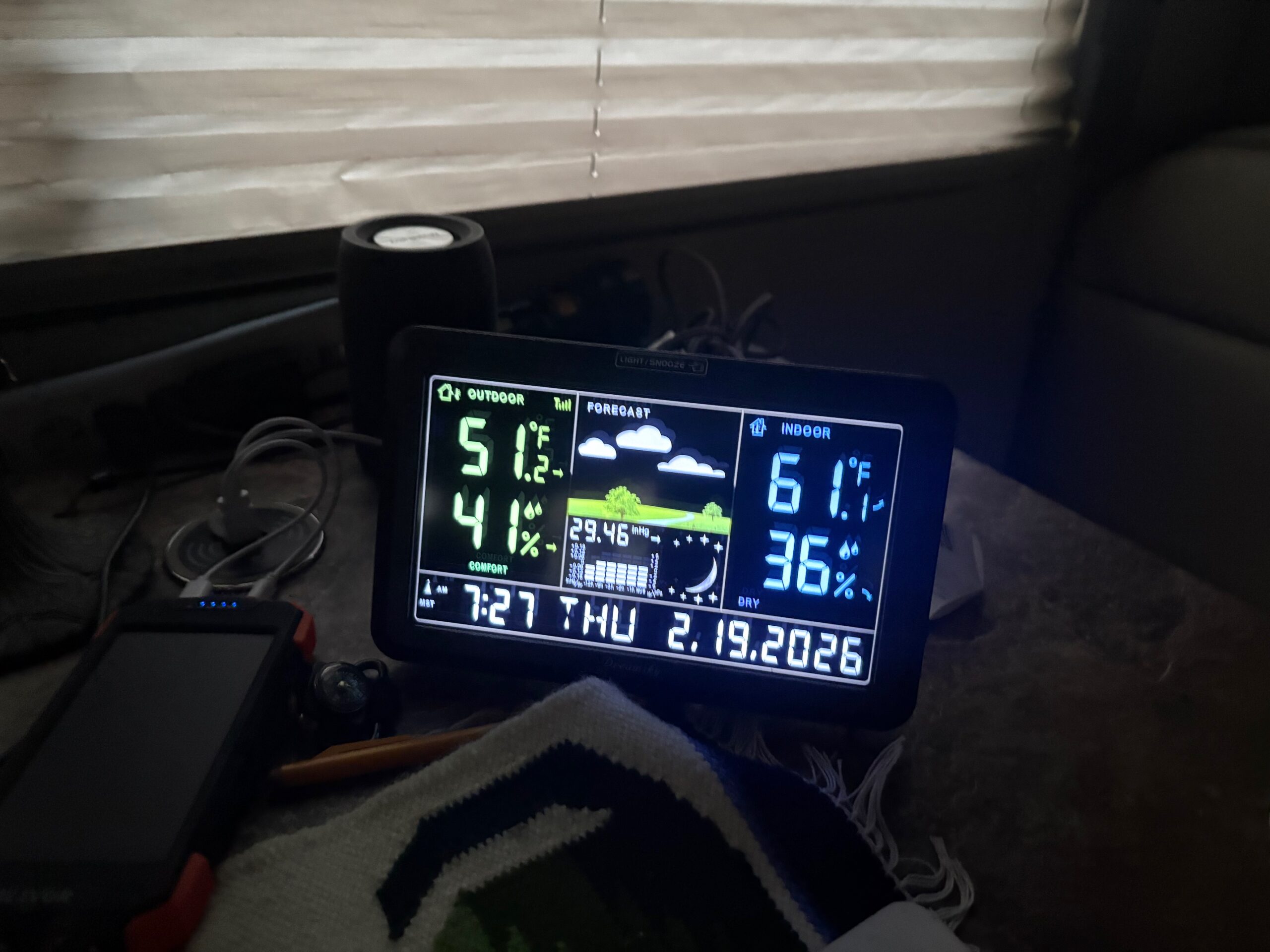 It is THURSDAY February 19, 2026. I slept until 7:30AM today. I set my alarm to get up for my meeting, but is was too cold to get up for it. I’ll go on Sunday……maybe! Anyway these were my temps this morning: