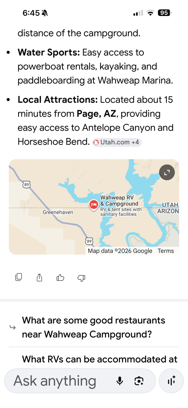 When we go to ZION in September ’27 we should try this park coming or going.  Also the Antelope Marina RV Park is OK, but not the best.  Also there is a beach campground in UTAH that looks cool – FCFS though, so I’m not sure we should try that, plus I’d hate to get stuck in the sand:
