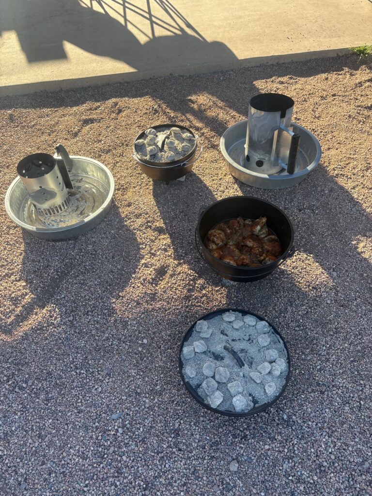 We had a Dutch Oven dinner tonight. Chicken thighs, mac & cheese, Chili and cornbread and Shephard’s Pie. It was all very delicious. I took my cheesecake and there are 4 pieces left for tomorrow. It was a great time. Here is a picture of a couple of the ovens: