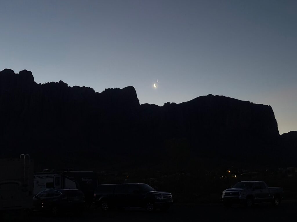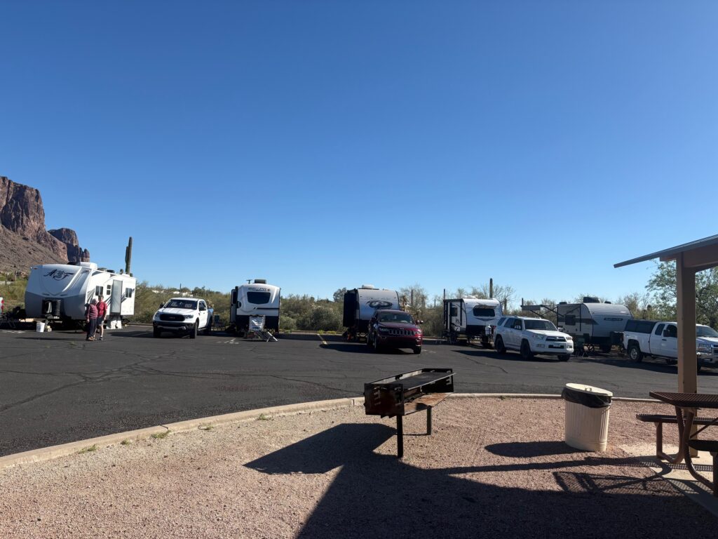 I have arrived at Lost Dutchman State Park. It’s 90 degrees right now, 87 in the rig. TOO HOT, but we’ll survive. The breeze is pretty good. I have 5 fans running. My STARLINK is set up and I can blog. That is what is important to me! Here is my view: