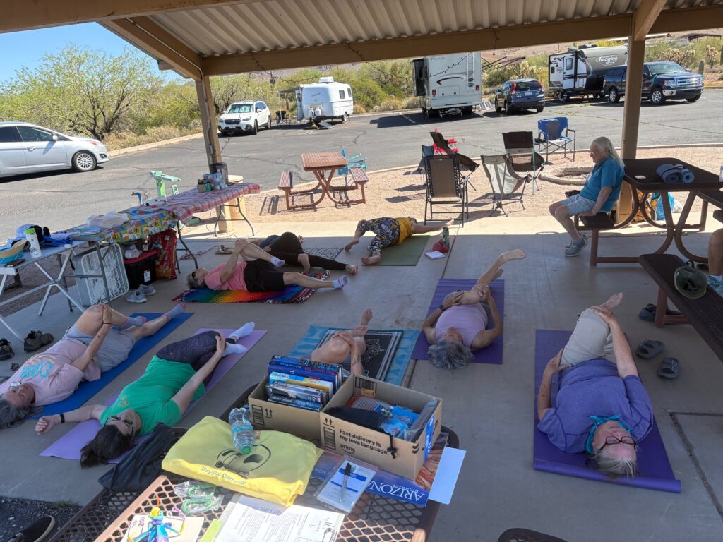 I just counted the rigs – 21 now. Linda Terres is supposed to come by today. That would make 22. We can have 29. I like it not so tight on my line. It’s more comfortable. Valerie led YOGA: